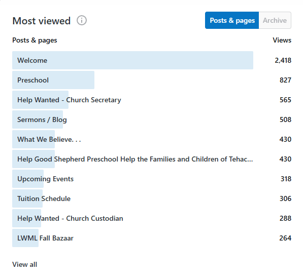 I’d like to give you an update on the Church website and how it’s doing. This website costs Good Shepherd Lutheran about $100 a year to operate. Everything is set to run almost on autopilot, it only needs one operator to post the sermon weekly and make minor changes here and there. The $100 fee is paid to WordPress for the domain and other blogging services that come with the account.